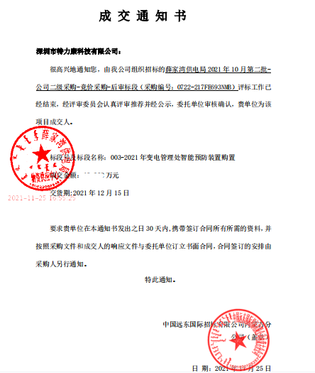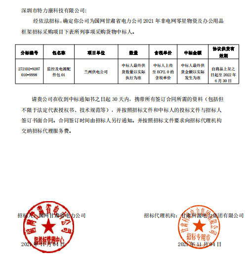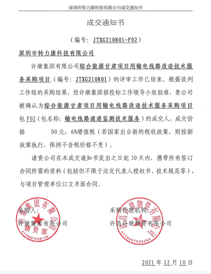特力康中標國網黑龍江送變電工程公司的2024年度第18次物資類競爭性談判采購項目——慶陽驅鳥器物資框 特力康中標國網甘肅省電力公司省管產業單位2024年第五次物資競爭性談判授權采購項目 中標喜訊:深圳市特力康科技有限公司成功入圍許繼集團綜合能源公司輸電線路視頻在線監測裝置模塊集采項目 中標喜訊:特力康成功中標國網重慶市電力公司渝中一片區項目 特力康成功中標國網天津市電力公司2024年第二次?物?資招標項目 特力康中標國網安徽省電力有限公司蕪湖供電公司2024年3月非物質采購項目 四川電力用特力康架空輸電線路山火監測裝置,筑牢林區輸電 “防火墻”? 遼寧電力啟用特力康多視角監拍裝置,全維度守護輸電安全? 破解黃土高原沉降難題:山西電力用特力康北斗裝置守桿塔安全? 山東電力啟用特力康動態版智能激光驅鳥器,動態防控守護變電站安全? 湖南超高壓電力啟用特力康球機 AI 監測裝置,智能守護輸電通道安全? 廣西電力啟用特力康高壓電纜護層環流監控設備,筑牢電纜安全防線? 山東電力用上特力康綜合驅鳥器,多手段守護變電站安全? 陜西電力啟用特力康智能預警系統,多維監測守護輸電安全? 寧夏配電線路安裝了我司防外破電子化智能警示牌