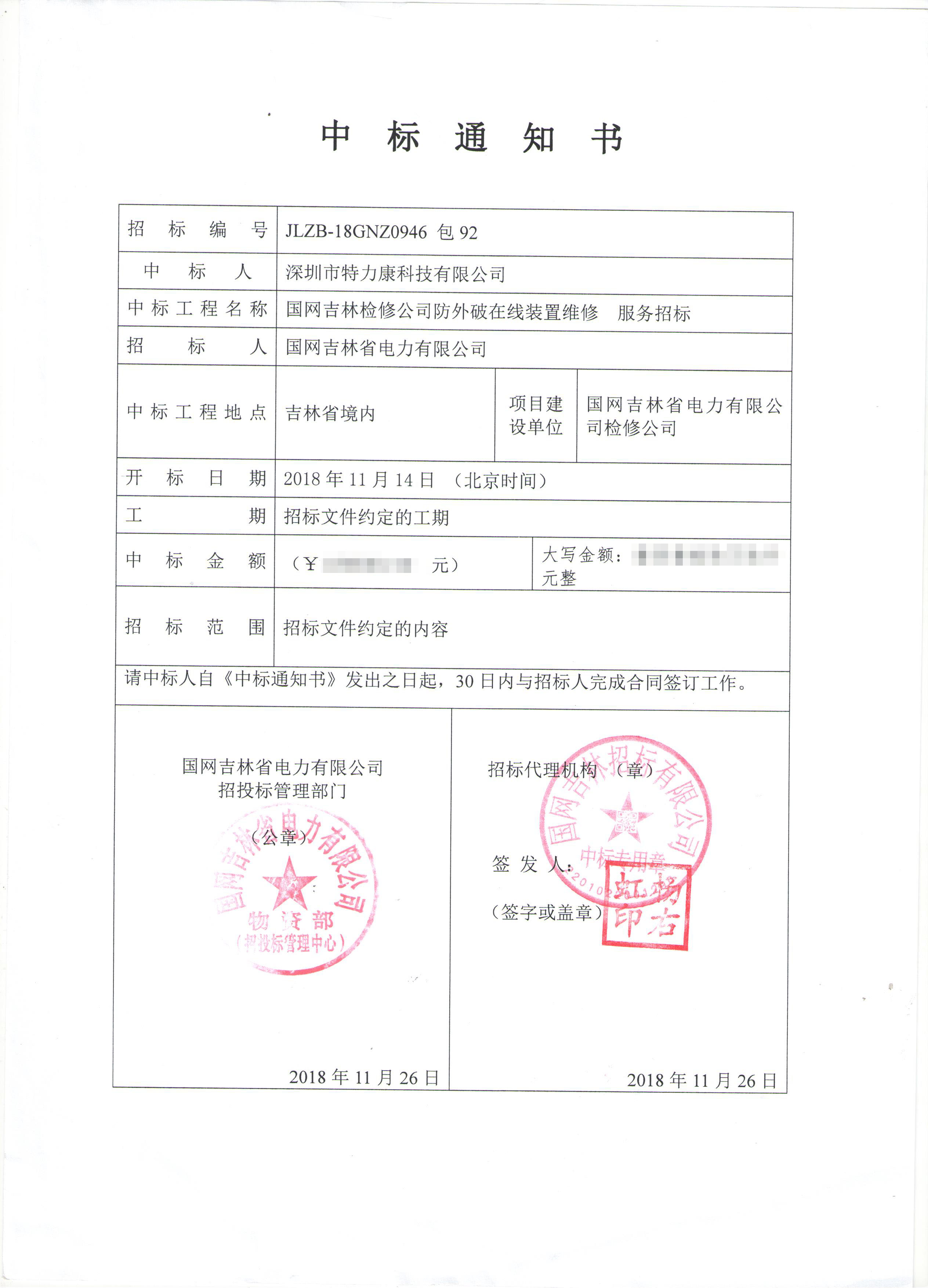 國網(wǎng)吉林省電力公司防外破裝置項目采購項目評審工作已結(jié)束,經(jīng)評審委員會評審,經(jīng)國網(wǎng)吉林省電力公司招投標(biāo)領(lǐng)導(dǎo)小組批準(zhǔn),將評審結(jié)果公示。我司被確定為中標(biāo)單位現(xiàn)將公告公示。