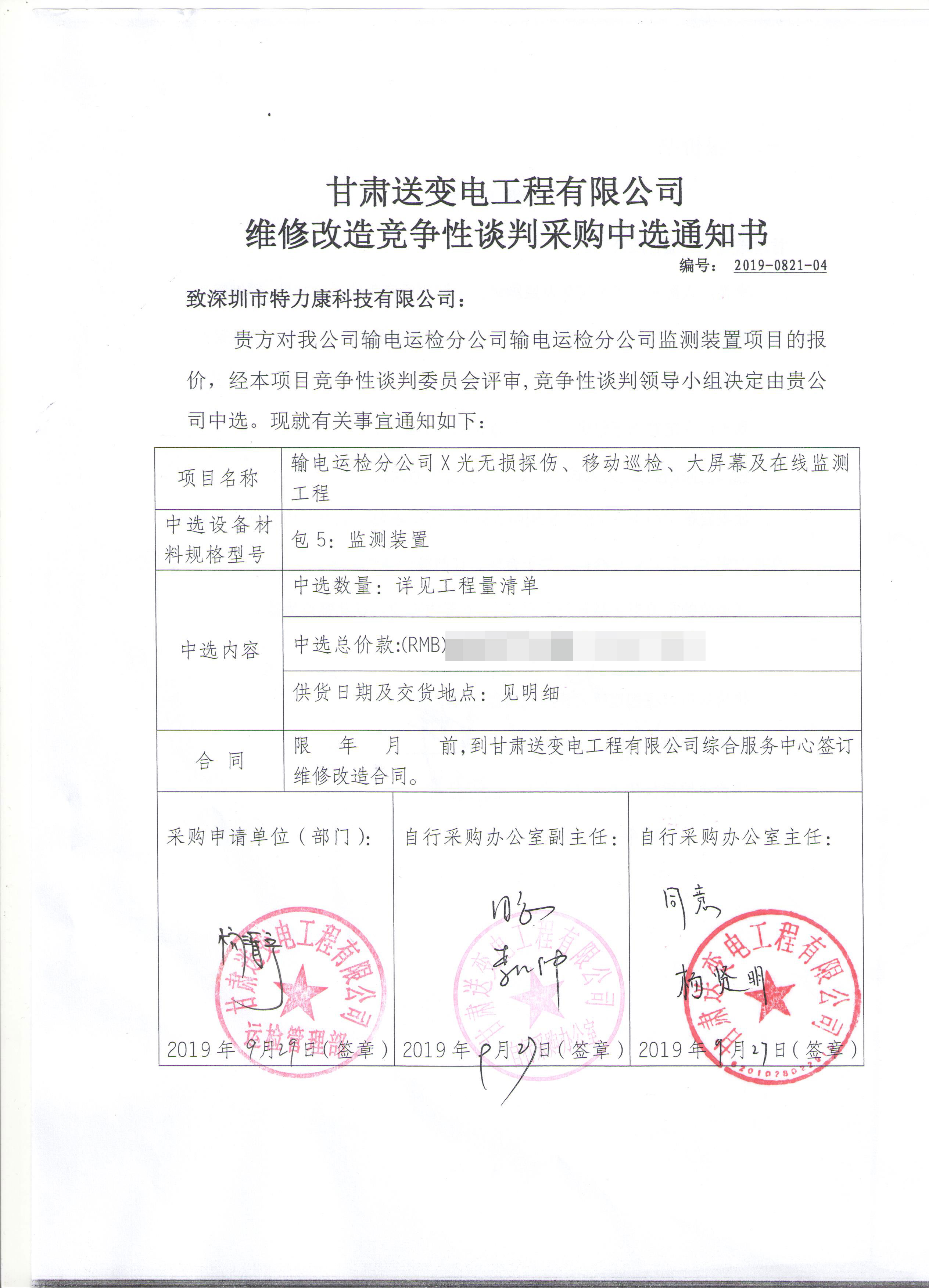 經(jīng)審委員會(huì)根據(jù)招標(biāo)程標(biāo)次評審、對有效標(biāo)書認(rèn)真評審,競爭性談判領(lǐng)導(dǎo)小組確定我司為甘肅送變電工程有限公司維修改造競爭性談判采購項(xiàng)目中標(biāo)單位。